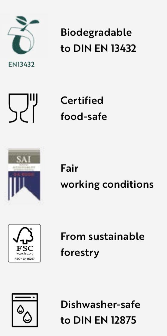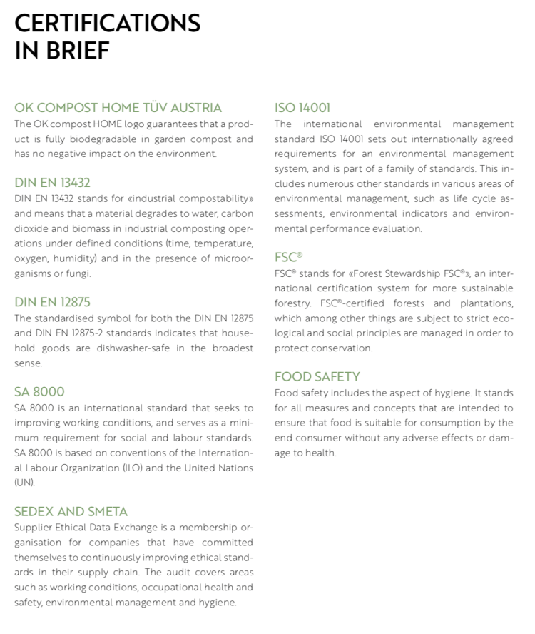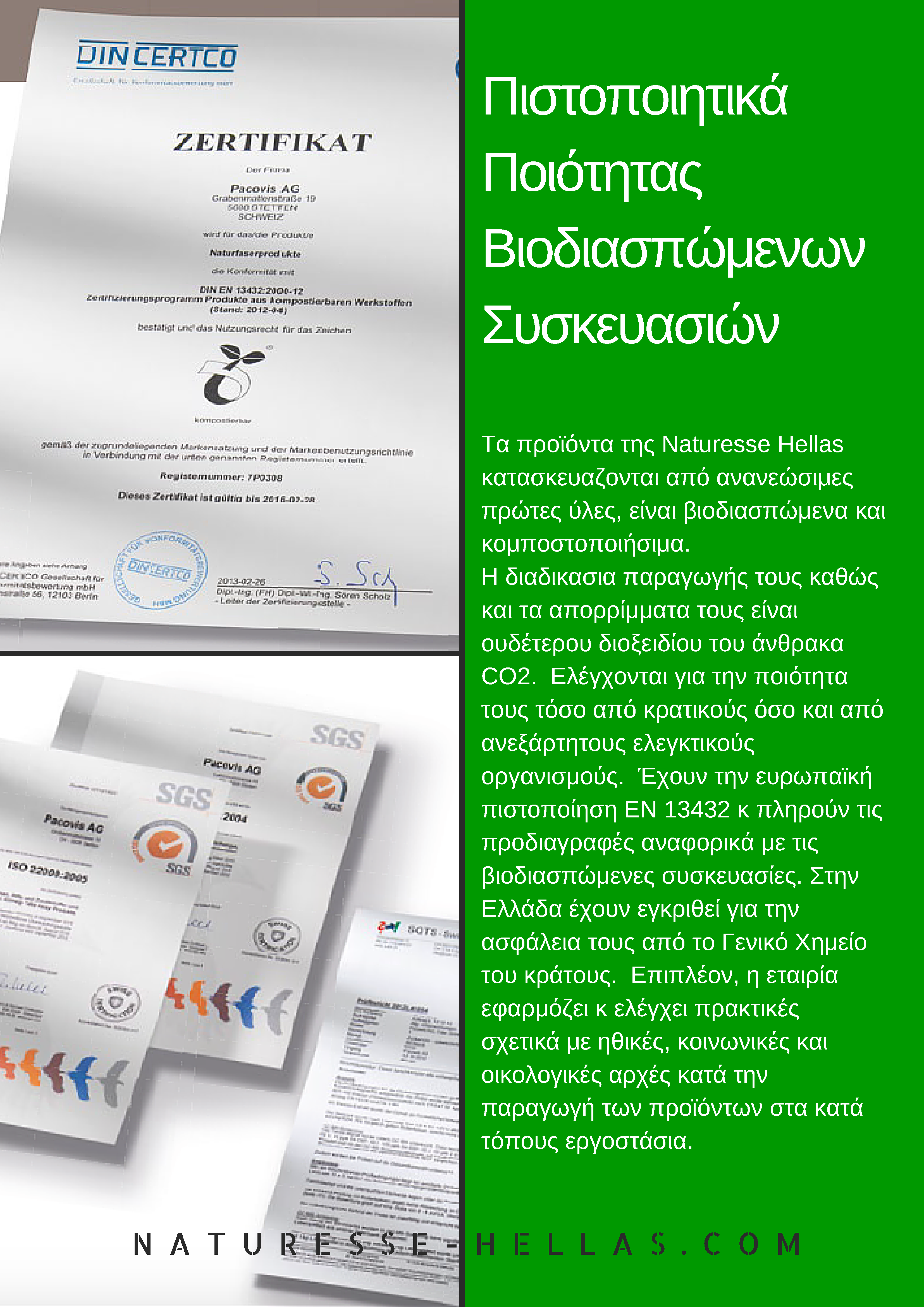 Έχουν την ευρωπαϊκή πιστοποίηση EN 13432 κ πληρούν τις προδιαγραφές αναφορικά με τις βιοδιασπώμενες συσκευασίες. Στην Ελλάδα έχουν εγκριθεί για την ασφάλεια τους από το Γενικό Χημείο του κράτους.