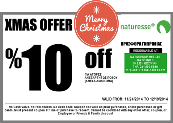 Καθώς πλησιάζουμε στο τέλος του 2014, η Naturesse Hellas σας ευχαριστεί για την προτίμηση, με δώρο κουπόνι έκπτωσης 10% για τους ήδη υπάρχοντες καθώς και νέους πελάτες !